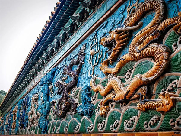 在紫禁城內(nèi)九條龍采用藍(lán)、紫、黃、白、黑等色,重色深沉敦厚,淺色明媚婉麗。琉璃壁的下層,以綠色表達海浪的深邃,以白色點明凌空盡濺的浪花,形成了瞬息萬變的激浪,又以近水襯托遠(yuǎn)水,以遠(yuǎn)水近浪共同襯托九龍,使整個畫面看上去雄偉壯闊,仿佛能聽到巨龍的長嘶和海水的咆哮。