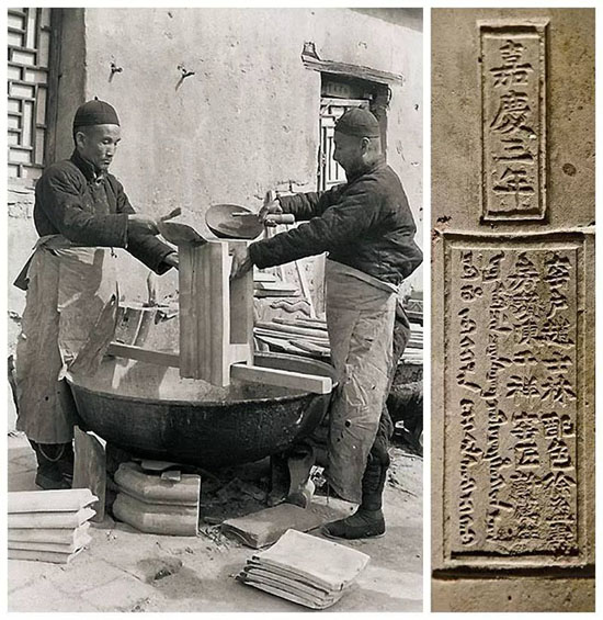 右圖瓦身背面有上下兩個長方形的戳記,上面的戳記寫著“嘉慶三年”,下面的寫著“窯戶趙士林、配色徐孟壽、房頭陳千祥、窯匠許萬祥”,旁邊尚有滿文對照。戳記除了說明琉璃的燒造年代,還證明琉璃渠官窯燒造有著明確的分工以及責(zé)任追認(rèn)制度。